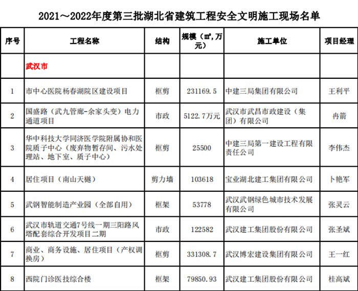 9月29日,從湖北省建設(shè)工程質(zhì)量安全協(xié)會傳來喜訊:由漢江城建集團承建的湖北文理學院新校區(qū)先進制造業(yè)實訓基地、華中農(nóng)業(yè)大學襄陽校區(qū)(現(xiàn)代農(nóng)業(yè)研究院)、湖北省鄂西北(襄陽)重大疫情救治基地三個項目同時榮登2021~2022年度第三批湖北省建筑工程安全文明施工現(xiàn)場和2022~2023年第一批湖北省建筑結(jié)構(gòu)優(yōu)質(zhì)工程項目名單。