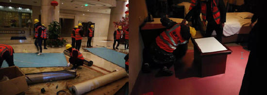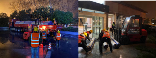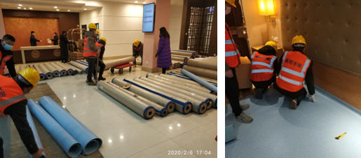 2月6日凌晨2點(diǎn)30分,第一車材料到達(dá)城市名人酒店,早已等候在現(xiàn)場(chǎng)的工人馬不停蹄開始卸貨、搬運(yùn)、裁減、鋪設(shè)施工,在疫情面前,市政人用團(tuán)結(jié)的精神、專業(yè)的技能、高效的協(xié)作,爭(zhēng)奪每一分每一秒。凌晨4點(diǎn),第二車材料到達(dá)共享國際酒店。