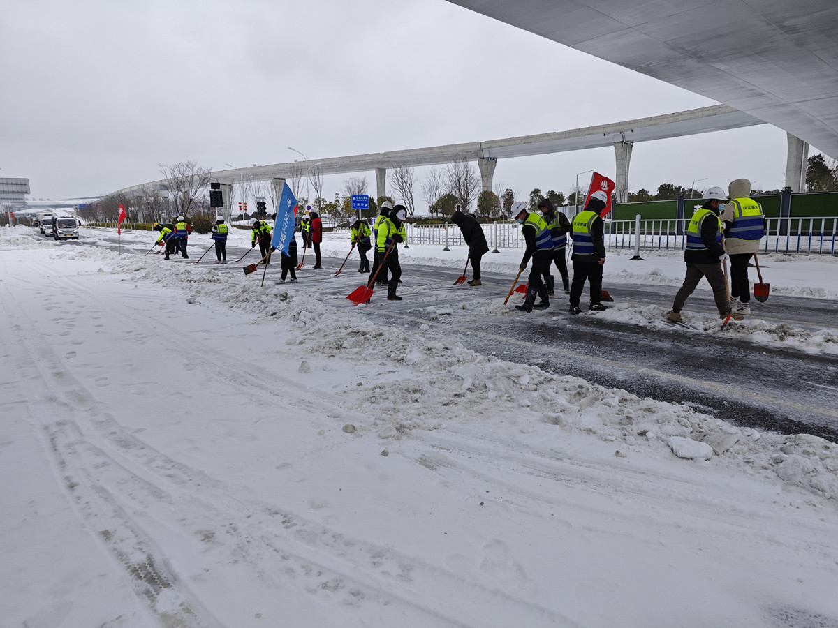 瑞雪迎新春,平安開新局。一夜之間暴雪覆蓋了整座城市,積雪不斷加深,給大家出行帶來極大不便。2月21日,漢江城建集團(tuán)有限公司襄陽職業(yè)技術(shù)學(xué)院東津校區(qū)建設(shè)項(xiàng)目部和襄陽技師學(xué)院二期工程項(xiàng)目部組織管理人員積極響應(yīng)集團(tuán)領(lǐng)導(dǎo)和東津管委會(huì)要求,前往東津新區(qū)高鐵南路路段、高鐵南路與現(xiàn)代大道交叉路口參與除雪搶險(xiǎn)工作,為路過車輛和居民開辟出了一條干凈、通暢的道路。