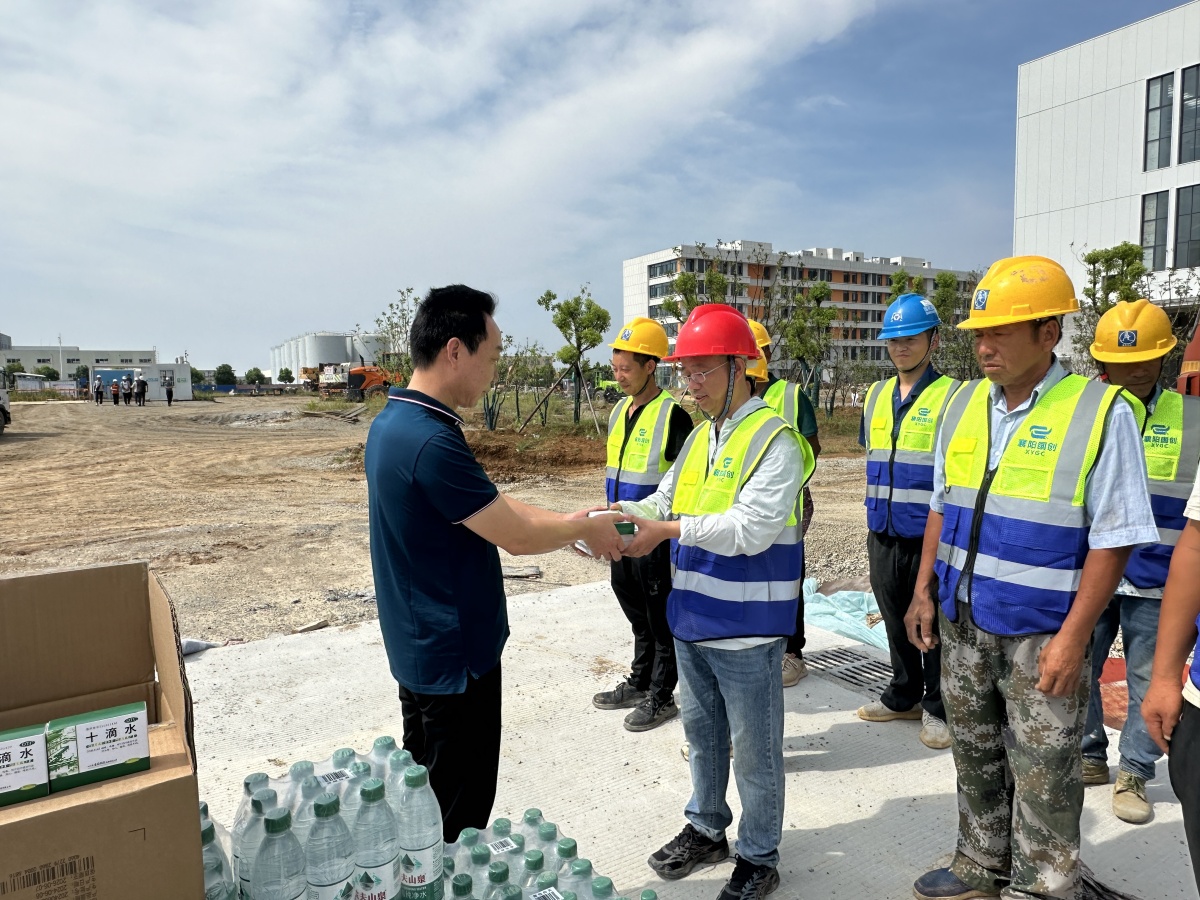 上午10點,國創(chuàng)公司班子成員到達項目工地現(xiàn)場,向辛勤工作的工人們送去了礦泉水、藿香正氣水、十滴水等防暑降溫物資,并叮囑大家在高溫天氣下注意防暑,確保身體健康。