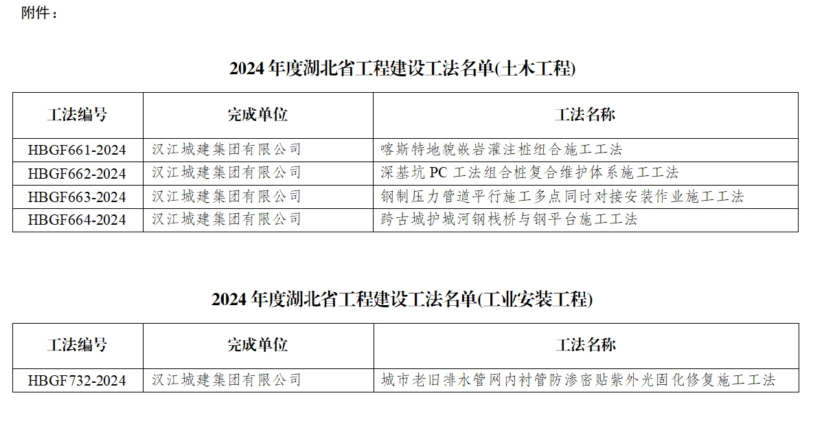 近日,湖北省住房和城鄉(xiāng)建設廳發(fā)布2024年度湖北省工程建設工法公告,由漢江城建申報的《喀斯特地貌嵌巖灌注樁組合施工工法》《深基坑PC工法組合樁復合維護體系施工工法》《鋼制壓力管道平行施工多點同時對接安裝作業(yè)施工工法》《跨古城護城河鋼棧橋與鋼平臺施工工法》《城市老舊排水管網內襯管防滲密貼紫外光固化修復施工工法》五項工法被授予省級工法。截至目前,漢江城建共計獲得13項省級工法。