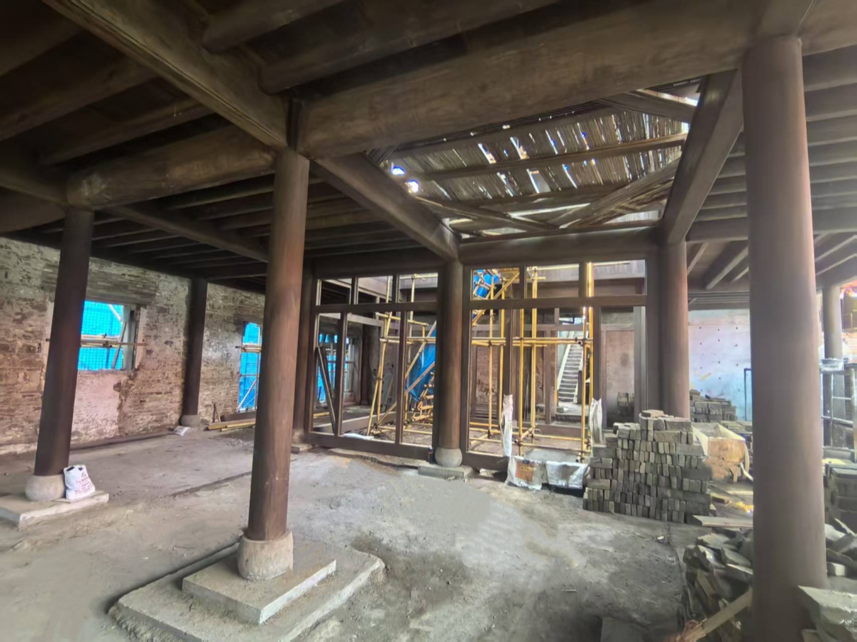 項目部秉持“修舊如故”原則,組建了一支由30余位資深古建筑匠人組成的專業(yè)團隊,在施工過程中嚴格執(zhí)行傳統(tǒng)工藝標準,采用傳統(tǒng)榫卯結(jié)構(gòu)拼裝工藝,運用木材數(shù)字編碼實現(xiàn)精準裝配,僅歷時七日,便完成了整棟建筑木結(jié)構(gòu)主體的搭建施工。當前,屋面系統(tǒng)完成望板鋪裝與防水體系構(gòu)建,室內(nèi)木作工程全面告竣,已完成總體進度的70%,下階段將重點推進清水磚墻修復(fù)、傳統(tǒng)小青瓦屋面鋪設(shè)及門窗構(gòu)件復(fù)原工作。
