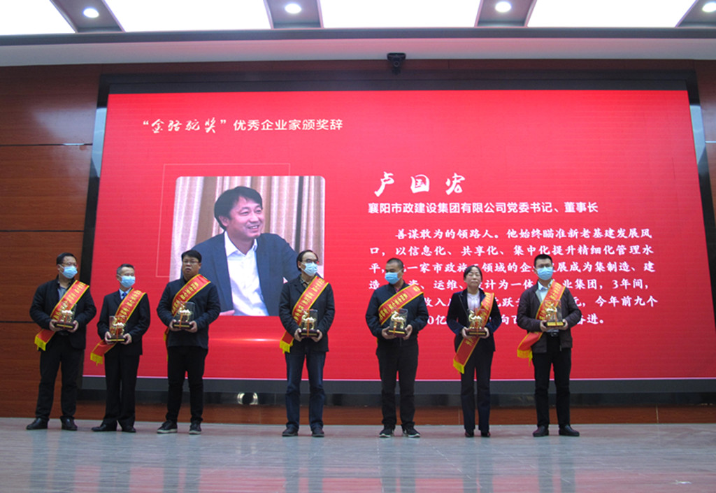 11月4日,2020襄陽工業(yè)企業(yè)百強榜發(fā)布暨第七屆 “金駱駝獎”優(yōu)秀企業(yè)家和第二屆“博亞杯”優(yōu)秀勞動者表彰大會在襄陽職業(yè)技術(shù)學(xué)院智能制造學(xué)術(shù)報告廳舉行。會上發(fā)布了2020襄陽百強工業(yè)企業(yè),并公布表彰了15名襄陽市第七屆“金駱駝獎”優(yōu)秀企業(yè)家以及250名2020“博亞杯”優(yōu)秀勞動者,襄陽市副市長李德璋為獲獎?wù)哳C獎。其中市政集團黨委書記、董事長盧國宏獲得襄陽市第七屆“金駱駝獎”優(yōu)秀企業(yè)家獎、陸衛(wèi)鋒、李娥、姜南被評選為優(yōu)秀勞動者。