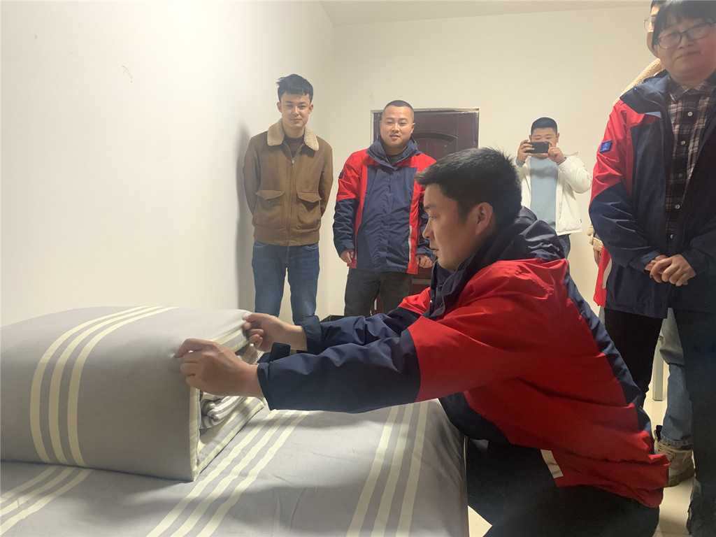 第三分公司為進(jìn)一步增強(qiáng)全體職工文明衛(wèi)生意識(shí),樹(shù)立優(yōu)良的生活作風(fēng)、養(yǎng)成良好的生活習(xí)慣,于3月16日組織職工進(jìn)行內(nèi)務(wù)整理活動(dòng);顒(dòng)中退伍老兵李晟同志親自上陣,向職工演示了軍人標(biāo)準(zhǔn)的整理內(nèi)務(wù)流程。“被子要疊得有棱有角”、“鞋要放整齊,成直線擺放”,“地面要整潔,決不能留衛(wèi)生死角”……退伍老兵李晟邊操作邊講解,熟練而精準(zhǔn)地借助 “壓、折、擠、掏”等基本動(dòng)作完成了從“棉被”到“豆腐塊”的華麗轉(zhuǎn)變。