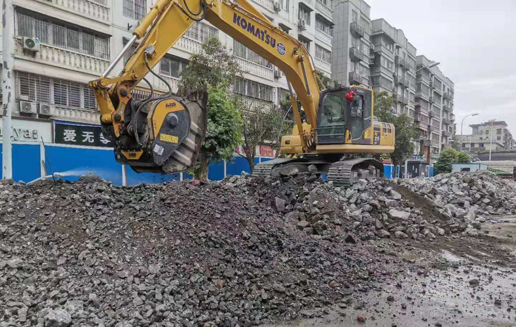 此次采用的新型挖機(jī)通過兩個(gè)過程完成粉碎動(dòng)作,首先是用破碎裝置將原有結(jié)構(gòu)層破碎成中小結(jié)構(gòu),然后用粉碎裝置將其分解成中細(xì)粒徑,整個(gè)施工過程中振動(dòng)小,基本無噪音,有利于主城區(qū)的施工,前后兩個(gè)過程流水作業(yè),工作效率高,省略了傳統(tǒng)開槽施工裝卸轉(zhuǎn)運(yùn)的工序,從人工、時(shí)間和空間上節(jié)省了大量費(fèi)用,同時(shí)也避免了因裝卸作業(yè)產(chǎn)生的揚(yáng)塵遺撒和泄露等環(huán)保問題。