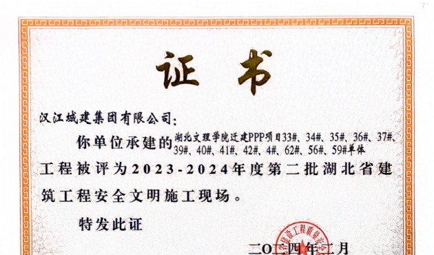 漢江城建兩個項目獲評2023~2024年度第二批湖北省建筑工程安全文明施工現(xiàn)場