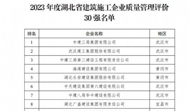 近日,湖北省建設(shè)工程質(zhì)量安全協(xié)會(huì)公布2023年度湖北省建筑施工企業(yè)質(zhì)量管理評(píng)價(jià)30強(qiáng),漢江城建集團(tuán)光榮入選,全市僅此2家企業(yè)上榜