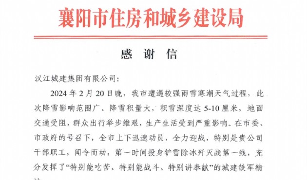 2月26日,襄陽(yáng)市住房和城鄉(xiāng)建設(shè)局送來(lái)感謝信,對(duì)漢江城建集團(tuán)干部職工聞令而動(dòng),第一時(shí)間投身鏟冰除雪殲滅戰(zhàn)第一線的奉獻(xiàn)精神表示