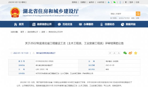 近日,湖北省住房和城鄉(xiāng)建設廳發(fā)布了《關于2022年度湖北省工程建設工法(土木工程類、工業(yè)安裝工程類)評審結(jié)果的公告》,對審定