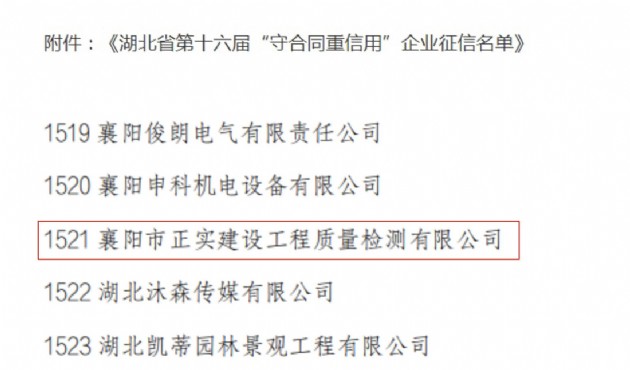 近日,襄陽市正實建設(shè)工程質(zhì)量檢測公司順利通過湖北省市場監(jiān)督管理局評審,榮獲“湖北省守合同重信用企業(yè)”稱號。&ldq