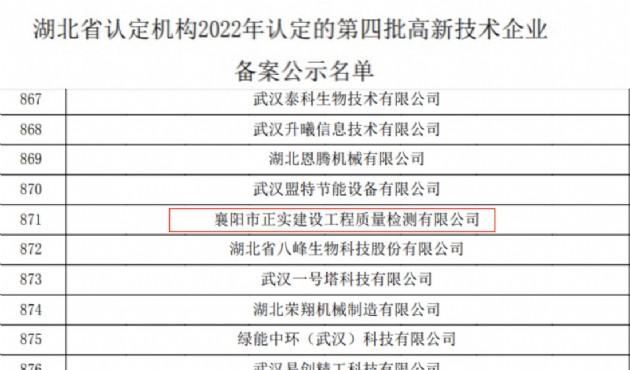 近日,漢江城建的全資子公司襄陽市正實建設(shè)工程質(zhì)量檢測有限公司正式通過了國家高新技術(shù)企業(yè)認證,憑借專業(yè)的研發(fā)隊伍,雄厚的技