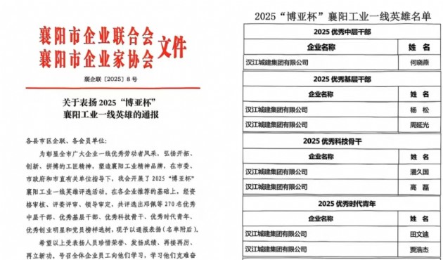 喜報(bào)!漢江城建集團(tuán)多名干部職工 榮獲2025"博亞杯"襄陽工業(yè)一線英雄稱號(hào)