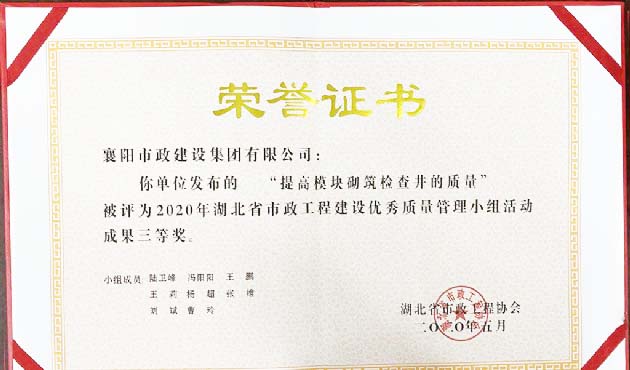 2020年“提高模塊砌筑檢測(cè)井的質(zhì)量”湖北省市政工程建設(shè)優(yōu)秀質(zhì)量管理小組活動(dòng)成果三等獎(jiǎng)