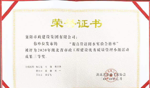 2020年“提高管道閉水實(shí)驗(yàn)合格率”湖北省市政工程建設(shè)優(yōu)秀質(zhì)量管理小組活動(dòng)成果三等獎(jiǎng)