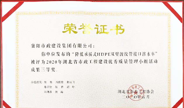 2020年“降低承插式HDPE雙壁波紋管接口滲水率”湖北省市政工程建設(shè)優(yōu)秀質(zhì)量管理小組活動(dòng)成果三等獎(jiǎng)