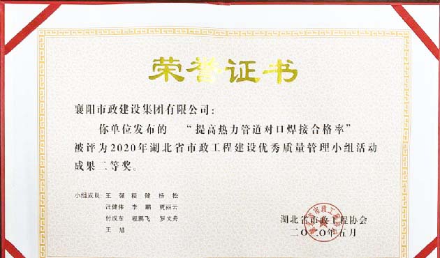2020年“提高熱力管道對(duì)口焊接合格率”湖北省市政工程建設(shè)優(yōu)秀質(zhì)量管理小組活動(dòng)成果二等獎(jiǎng)