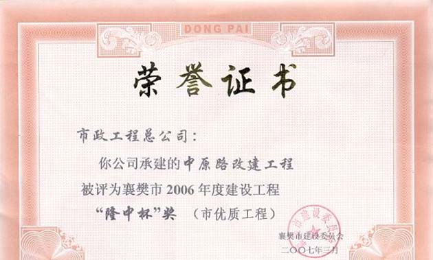 2012樊宛路工程襄陽市“隆中杯”證書