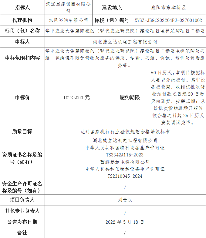 華中農(nóng)業(yè)大學(xué)襄陽校區(qū)(現(xiàn)代農(nóng)業(yè)研究院)建設(shè)項(xiàng)目電梯采購項(xiàng)目二標(biāo)段于2022年5月 10日在襄陽市公共資源交易網(wǎng)、湖北省公共資源交易電子服務(wù)平臺(tái)、漢江城建集團(tuán)有限公司官網(wǎng)發(fā)布中標(biāo)候選人公示,公示期為2022年5月10日至2022年5月12日(北京時(shí)間)。公示期間無異議、投訴,F(xiàn)對(duì)本次招標(biāo)的中標(biāo)結(jié)果公示如下: