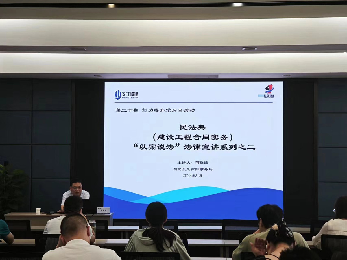 此次培訓(xùn),特邀湖北長久律師事務(wù)所何群濤律師專題授課,整個培訓(xùn)采用理論與案例相結(jié)合的方式,根據(jù)建設(shè)工程案件實例開展,全面剖析公司建設(shè)工程施工合同糾紛、確認勞動關(guān)系等典型案例,從訴訟案件基本情況、相關(guān)法律法規(guī)以及如何防范法律風(fēng)險等幾個方面進行詳細講解,對公司內(nèi)部開展法律風(fēng)險防控具有很好的指導(dǎo)作用。通過培訓(xùn),使大家在與分包單位簽訂合同、項目管理過程中增強識別、防范和化解法律風(fēng)險的能力。大家紛紛表示本次培訓(xùn)內(nèi)容貼近工作實際,具有很強的理論指導(dǎo)性和實操性。