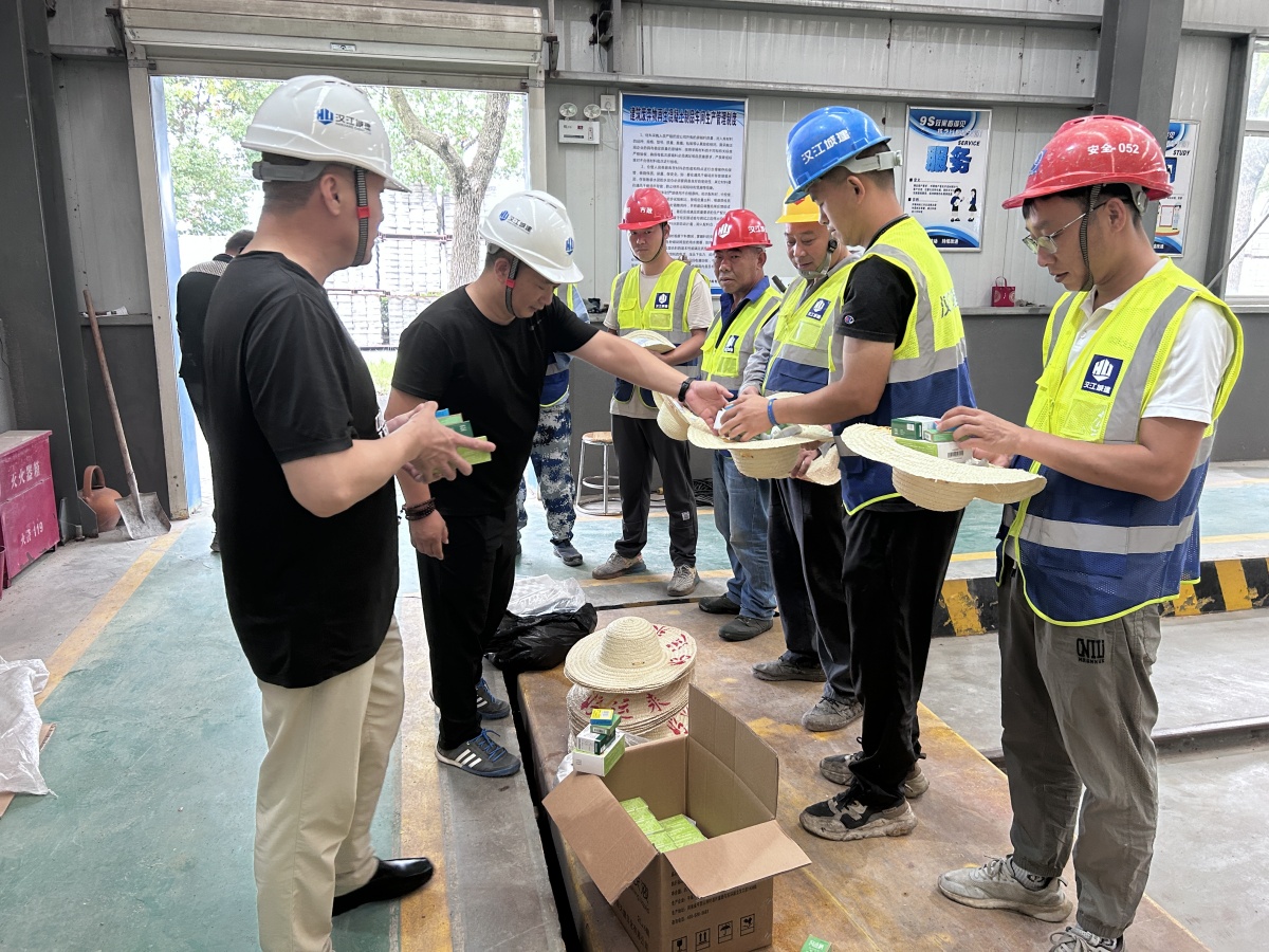 在新材料公司制磚車間內(nèi),公司領(lǐng)導(dǎo)班子成員為一線生產(chǎn)工人送上防暑降溫慰問品,發(fā)放宣傳頁,普及防暑知識(shí)和職業(yè)病預(yù)防知識(shí),并與他們親切交談,了解大家的工作及生活情況,對(duì)他們堅(jiān)守工作崗位表示感謝和致以敬意,叮囑大家要合理安排工作,注重崗位操作安全,同時(shí)要注意防暑降溫,保重身體,增強(qiáng)自我安全防范意識(shí),確保各項(xiàng)工作安全、有序推進(jìn)。