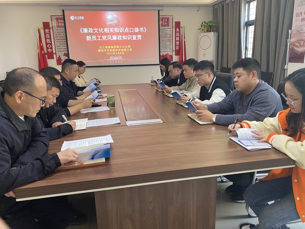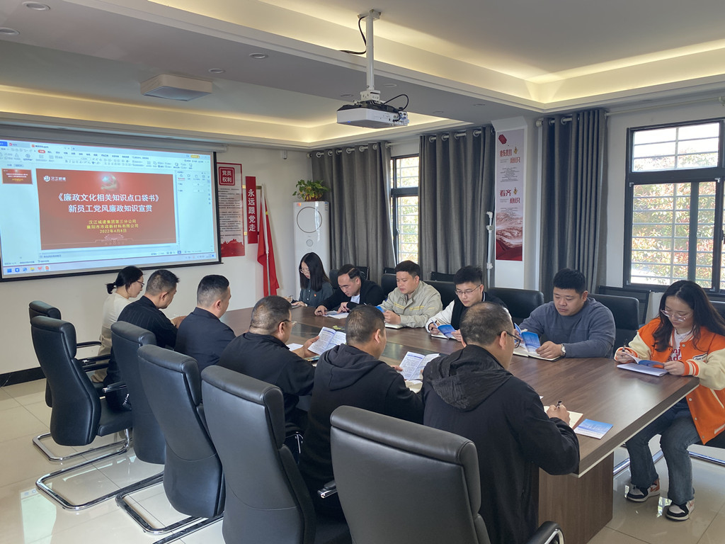 會(huì)議由新材料公司書記孔慶銳主持,首先由新材料公司紀(jì)檢委員黃玉萍、第三分公司紀(jì)檢委員張軍政分別向新進(jìn)員工發(fā)放了廉政文化相關(guān)知識(shí)點(diǎn)口袋書。接著,新材料公司經(jīng)理馬龍針對(duì)口袋書,主要從“中央八項(xiàng)規(guī)定主要內(nèi)容”、“中央八項(xiàng)規(guī)定精神具體方向”等內(nèi)容深入淺出地對(duì)新進(jìn)員工進(jìn)行了宣貫教育,提醒新進(jìn)員工在大事上一定要涇渭分明,小節(jié)上時(shí)刻從嚴(yán)把握,哪些事能做,哪些事不能做,腦子里要有明確的界限。然后,第三分公司經(jīng)理戴玉郎宣讀了“漢江國有資本投資集團(tuán)有限公司員工處分暫行規(guī)定(試行)”,讓大家明晰了集團(tuán)公司的黨紀(jì)處分規(guī)定。隨后,新進(jìn)員工黃冬麗、劉桂烜代表發(fā)言,表達(dá)了自己的黨風(fēng)廉政學(xué)習(xí)感悟。最后,第三分公司黨支部書記李愛國做會(huì)議總結(jié),強(qiáng)調(diào)新進(jìn)員工要時(shí)刻對(duì)照學(xué)習(xí),嚴(yán)于律己,堅(jiān)決與不良風(fēng)氣作斗爭,踏踏實(shí)實(shí)做事,干干凈凈做人,時(shí)時(shí)刻刻守好初心,筑牢防線。